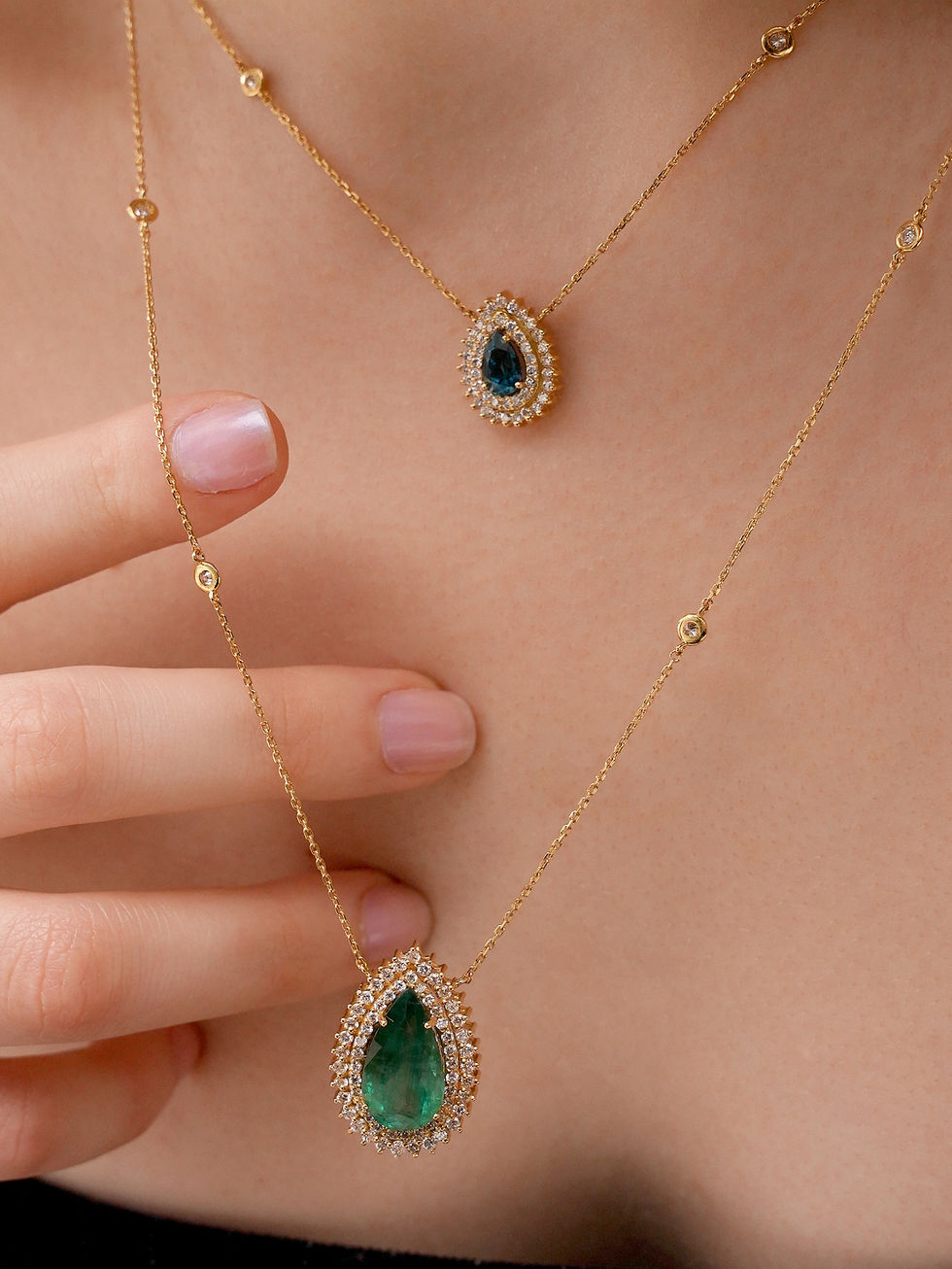 Colar Duplo em Ouro Amarelo 18K com Turmalina, Esmeralda e Diamantes